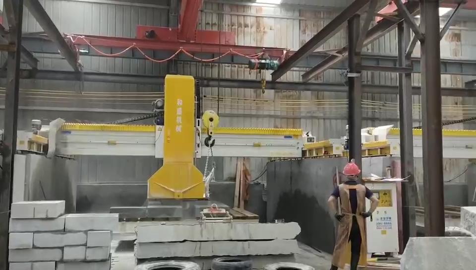 本機橫梁采用鋼制構造件, 強度高不易斷裂。整機重量重,切割平穩、下刀量大、產量高。 橫梁切割行走導軌采用高精度線性軌道,機身升降結構采用大直徑四導柱(直徑120mm)液壓升降。配有液壓推動旋轉工作臺,大梁移動實現橫向分片。具有加工長度大,切割深度大,旋轉靈活,定位準確,剛度大,工作平穩等特點。主機采用進口變頻器可實現切割速度的無級調速。適合大批量加工路沿石及高價值的墓碑石。