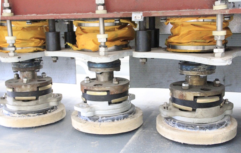 該機(jī)邊梁采用進(jìn)口線性道軌,提高了橫梁往復(fù)擺動的穩(wěn)定性及增快橫梁擺動速度,有利于提高工作效益。打蠟盤的升降和壓力大小均由氣動元件進(jìn)行控制調(diào)節(jié);電控系統(tǒng)采用PLC控制、觸摸屏輸入,輸送帶、橫梁往復(fù)速度均為變頻器調(diào)速;操作方便,性能穩(wěn)定。適用于花崗巖石板材、微晶石板材、人造石板材的拋光后道工序,提高板面的光澤度。