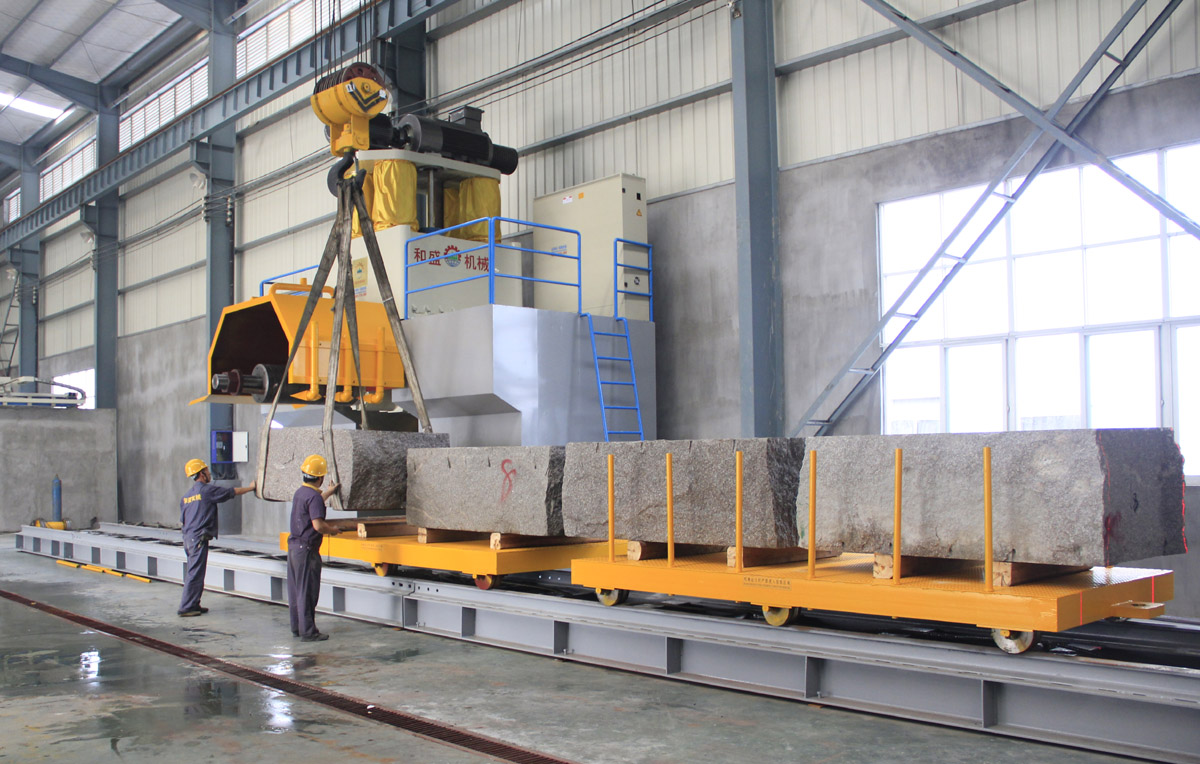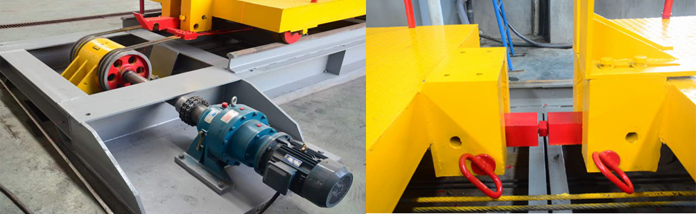 4:工作料車采用往復驅動裝置,可提高料車行走效率有利于提高產(chǎn)量。料車與牽拉帶的連接部位加裝有“載料車分合插銷”,解決了老機型更換荒料時要在工作臺上調(diào)整荒料位置后才能開機作業(yè),浪費有效加工時間的問題。