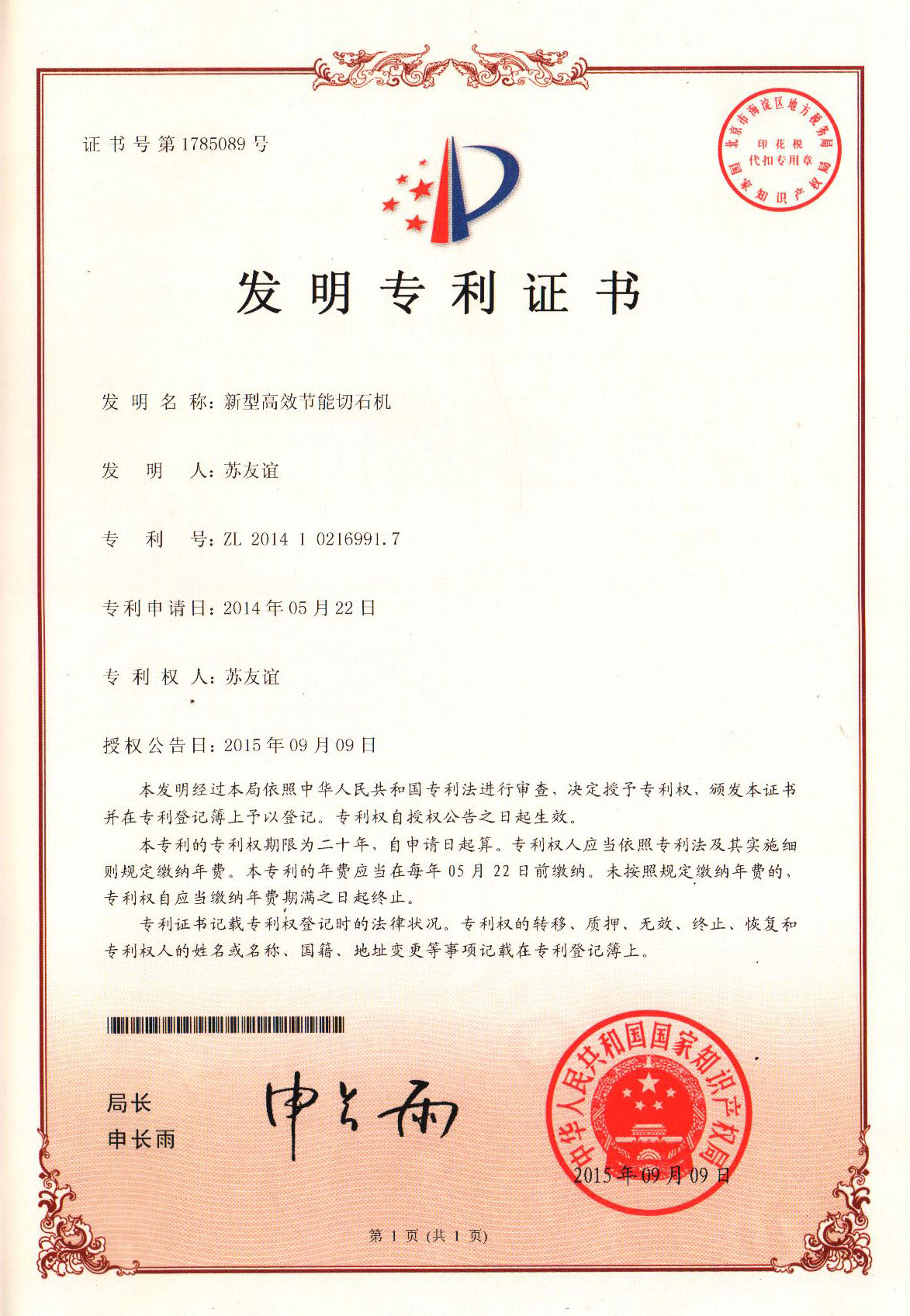 發(fā)明專利證書(仿冒必究) 查詢(點擊)